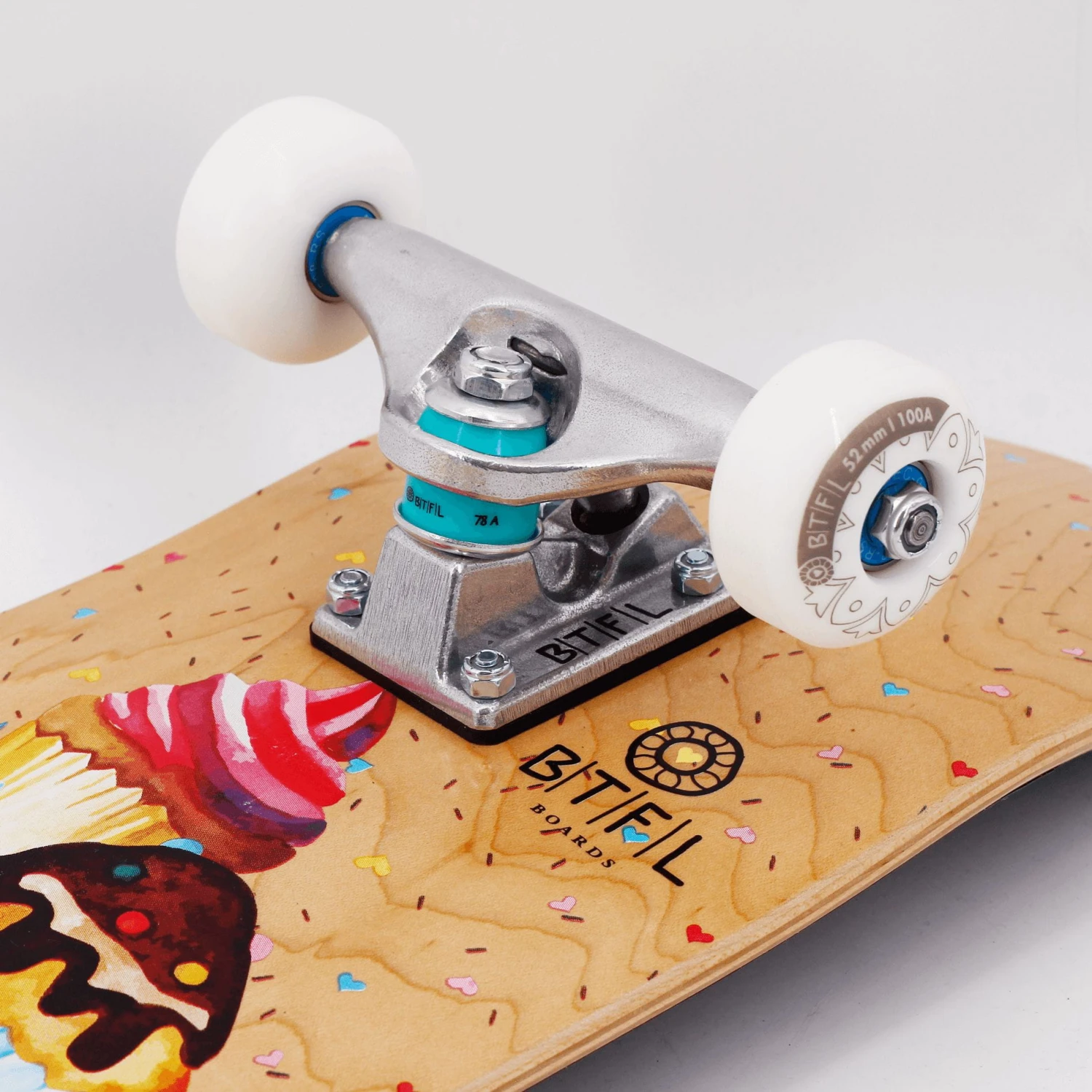 Sweet, sweeter, Alice. Mit diesem Board ist jedem Kind der Spaß garantiert, denn es ist speziell für Kinder konzipiert. Das Deck ist mit einer Länge von 71 cm und einer Breite von 19 cm kürzer und schmaler als herkömmliche Skateboards. Die Lenkgummies haben eine Härte von 78A, weshalb Kurven ohne große Anstrengung gefahren werden können.