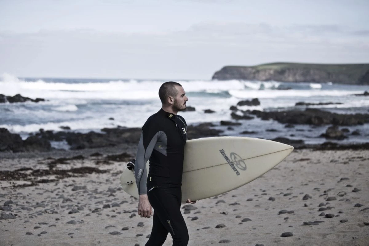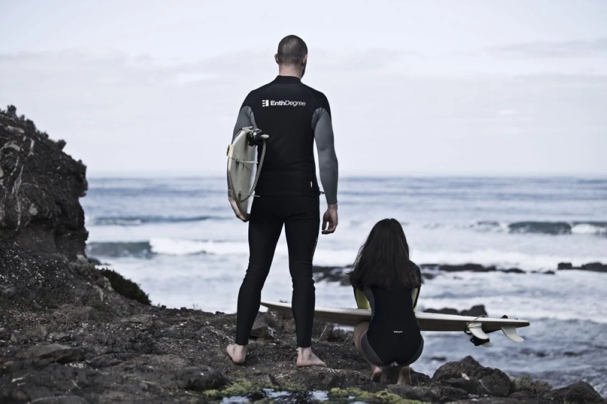Als wir anfingen, ließen wir uns von existierenden Neoprenanzügen inspirieren. Sie verwendeten dasselbe Material an der Außenseite und an der Innenseite. Unsere erste Verbesserung bestand darin, das Material an der Innenseite zu ändern. Die Paßform wurde besser und das weiche, gebürstete Lycra-Innenleben schützte vor Ausschlägen. Wir verwenden ein dreischichtiges Material. Die Außenhaut besteht aus superweichem Lycra, die Mitte aus Polyurethan und die innere Schicht aus weichem Fleece. Dies erlaubt dir zu schwitzen, aber es schützt dich auch vor dem Auskühlen durch Wind. Es ist viel beweglicher im Schulterbereich, länger im Torso, und es hält dich warm.