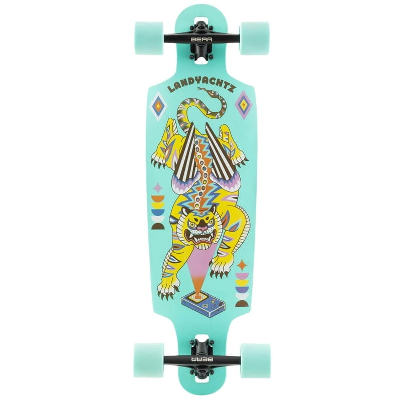 Rase die Straßen hinunter mit dem Landyachtz Drop Cat 33″ Longboard Complete! Dieses kompakte, direktionale Drop-Through-Longboard ist 33″ lang und 9,625″ breit. Die 7-Lagen-Konstruktion in einem so kleinen Board führt zu einer winzigen Menge an dämpfendem Flex, der deine Fahrt auf raueren Straßen glättet, während er immer noch steif genug ist, um etwas Geschwindigkeit und Rutschen zu bewältigen.