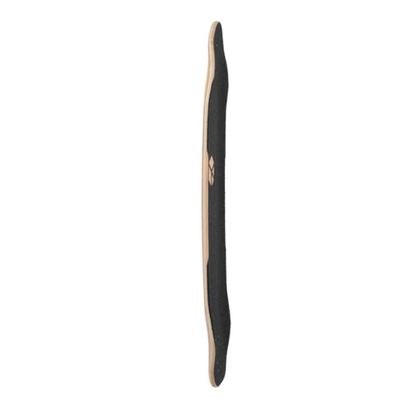Loaded hat das Tesseract mit einer intuitiven W Concave entwickelt um die Kontrolle des Fahrers in allen Toeside Manövern zu verbessern. Der zentrale Buckel ist groß aber auch breit, sodass man einen starken Seitenhalt in der Nähe der Übergänge hat, ohne im Komfort der Wölbung Abstriche zu machen. Das W-Concave auf dem Tesseract folgt einem sanften elliptischen Profil und wird in Richtung der Trucks zunehmend schwächer, wobei es etwa 2 cm hinter den innersten Befestigungslöchern komplett verschwindet. Dieses Design ermöglicht den Innenkanten der Füße sich gegen die W-Concave zu schmiegen (für Toesideslides), aber auch den Außenseiten der Füße in einer mehr radialen Wölbung hinter den ausgestellten Wheel Wells zu setzen (für höheren Komfort im Tucking bei langen Downhillabfahrten). Stufenlose aber auch sanfte Concave Rillen bieten optimale Kantenkontrolle, ohne auch hier auf Komfort zu verzichten.