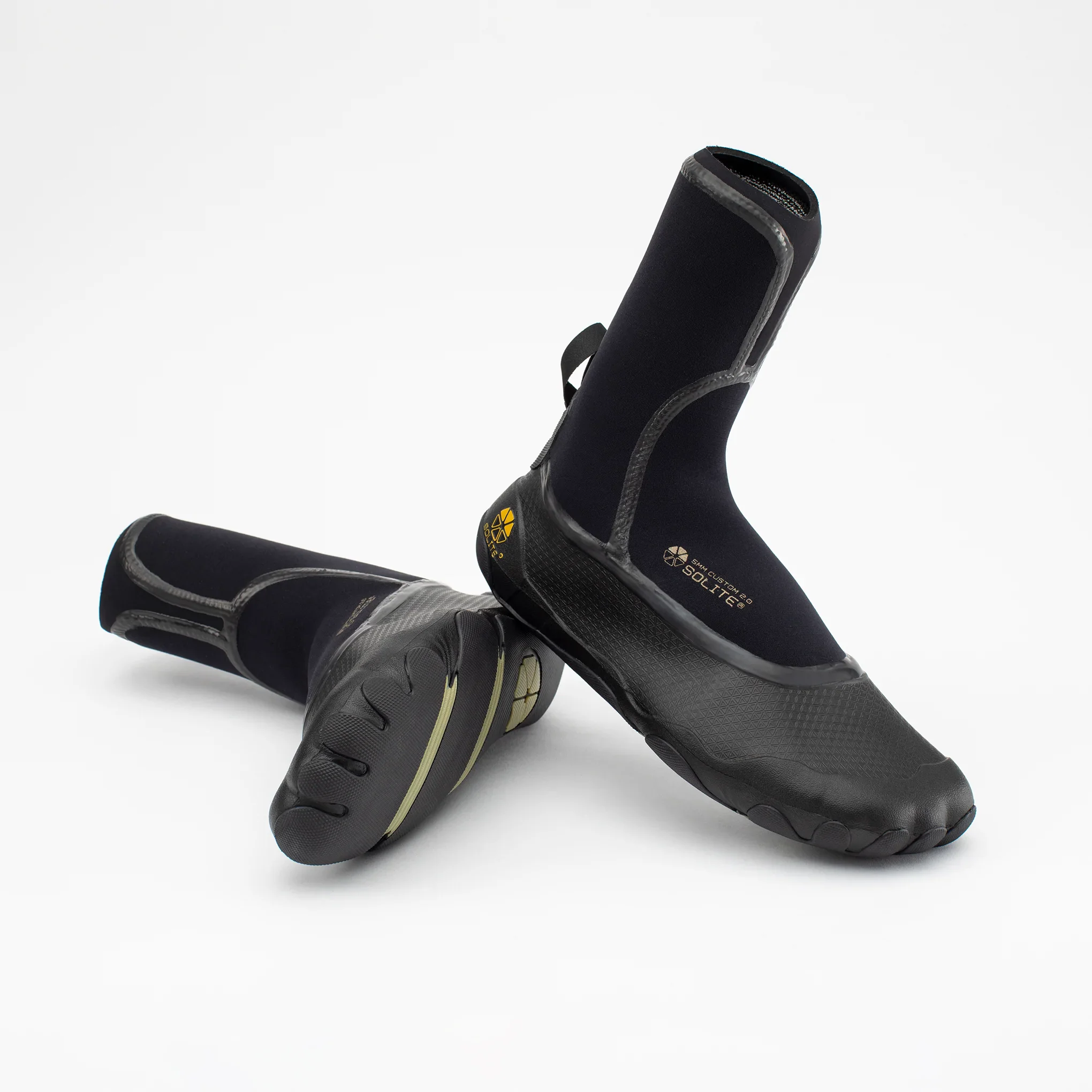 Wie alle Solite Boots der Serie 2.0 verfügt auch der 5 mm Custom 2.0 über eine 3D-geformte 1 mm dicke Naturkautschuksohle, die die Zehen und die Ferse umhüllt und so für mehr Strapazierfähigkeit und Schutz vor Steinen, Seeigeln und Riffen sorgt. Das einteilige Sohlendesign hinterlässt keine freiliegenden Lücken zwischen den Sohlenhülsen und sorgt so für zusätzlichen Schutz und Haltbarkeit.