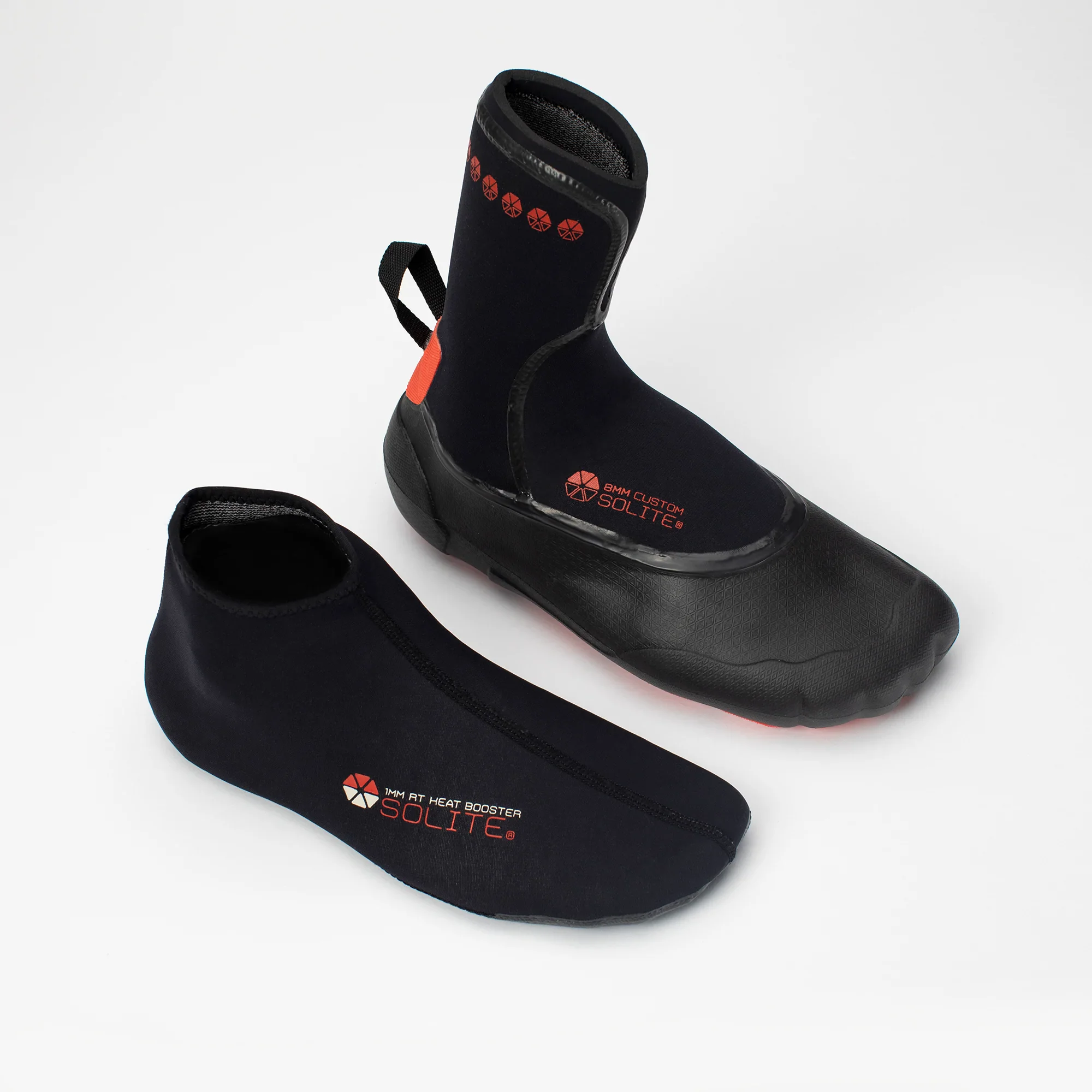 Die Solite 8mm Customs enthalten ein Paar von Solites 1mm Neopren Round-Toe Heat-Booster Socken in der Box. Diese Socken sind ein wichtiger Bestandteil des Solite „Systems“, insbesondere in den kalten Gewässern, in denen die 8mm Customs eingesetzt werden. Die Vorteile der 1mm Neoprensocken sind zahlreich: